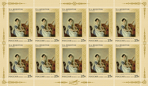 Марка номиналом 25 рублей. П.А. Федотов. «Портрет Н.П. Жданович за фортепьяно»