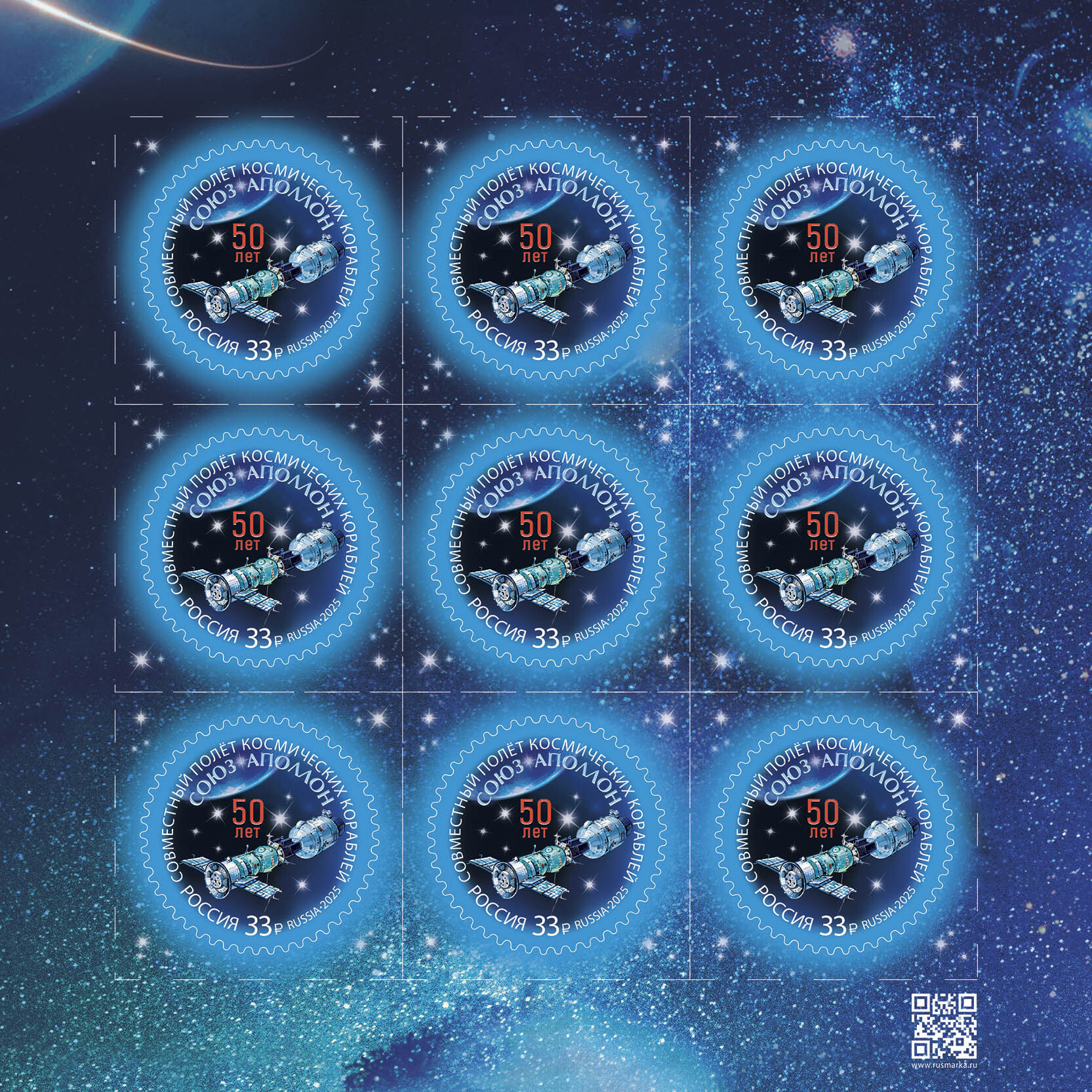 Марка номиналом 33 рубля. 50 лет совместному полёту космических кораблей «Союз» и «Аполлон»
