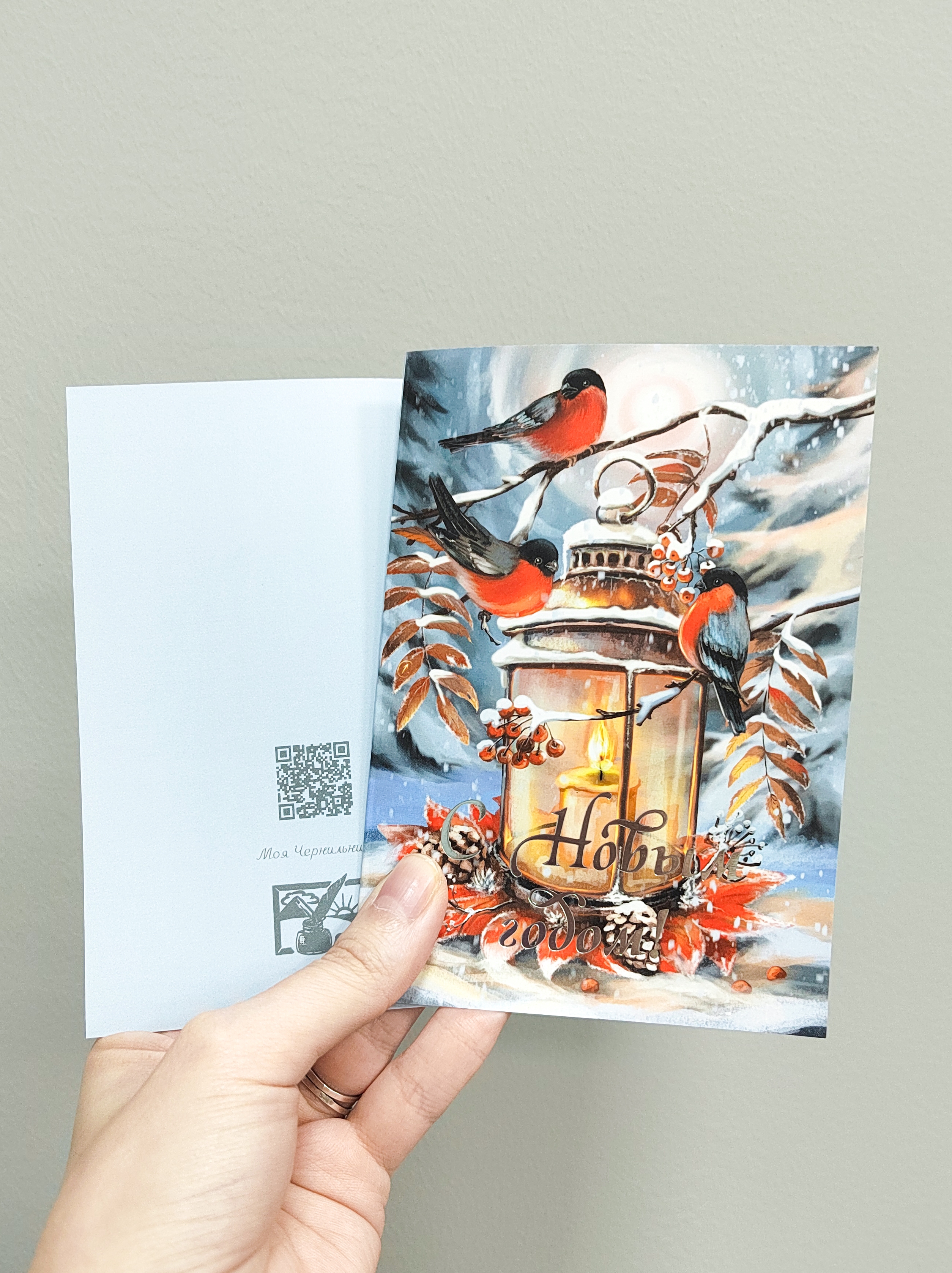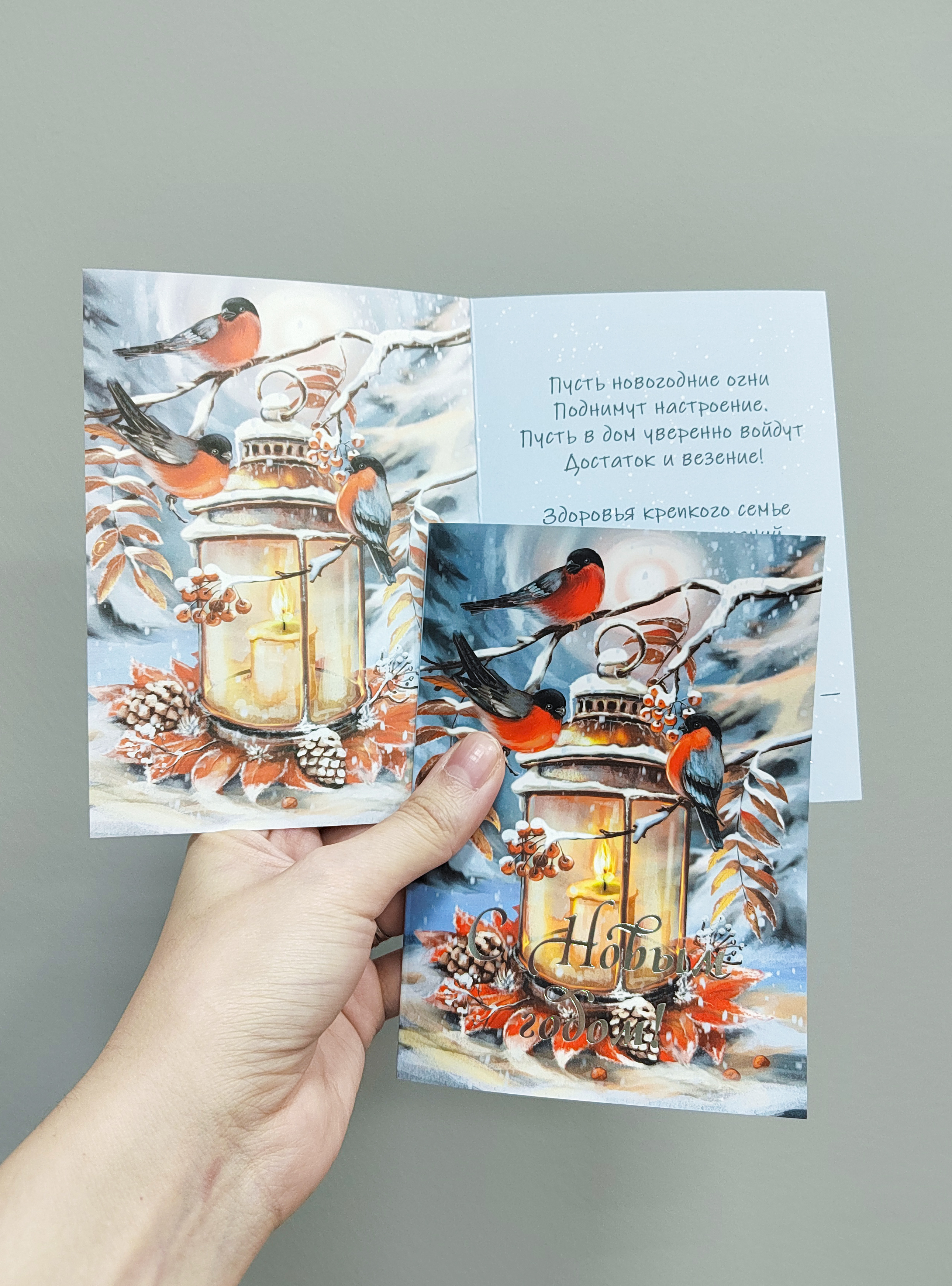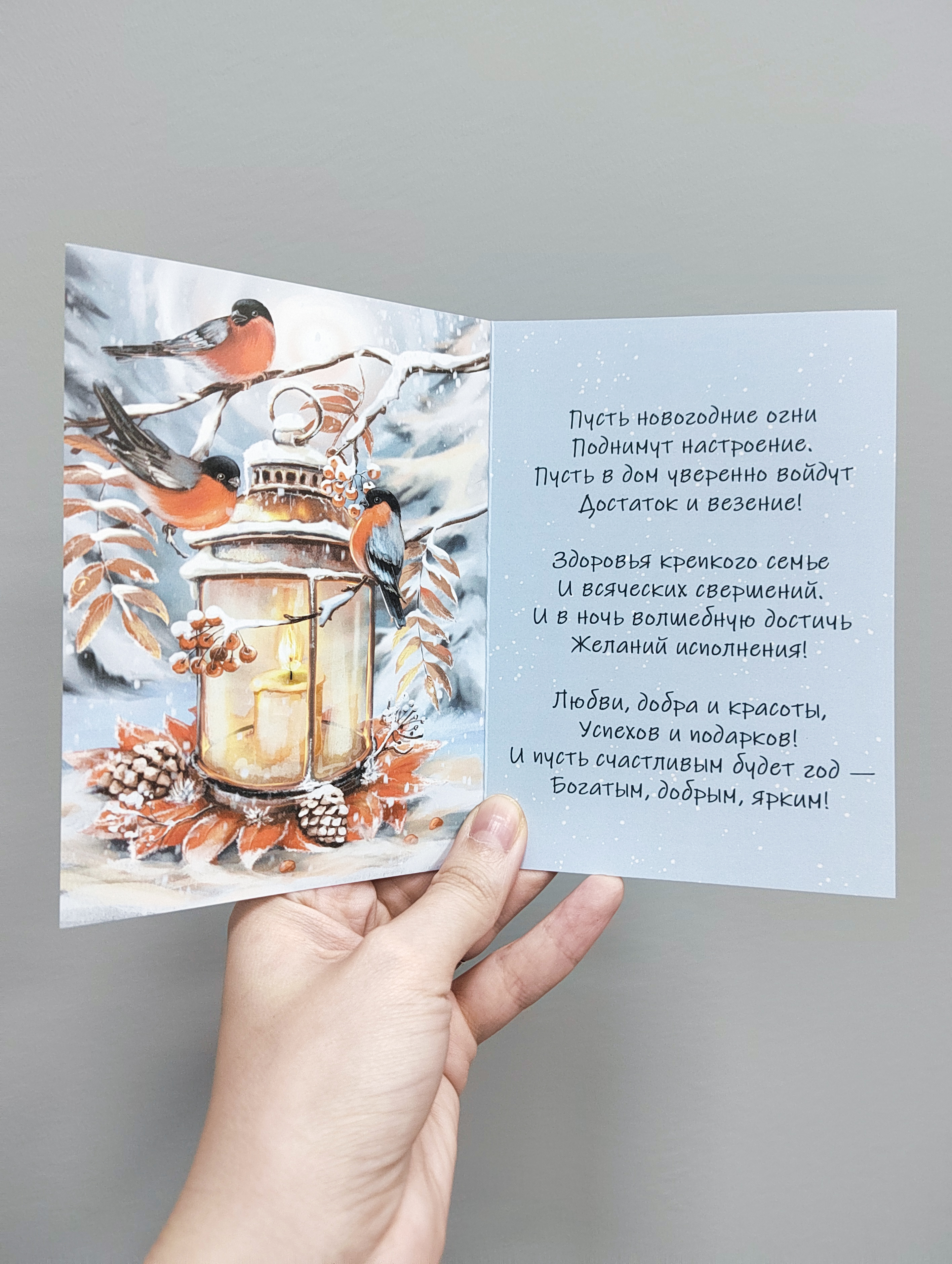 Открытка двойная, цветная внутри. Размер в сложенном виде А6. Внутри уже есть поздравление. На лице надпись "С Новым годом!" выполнена серебряным теснением.