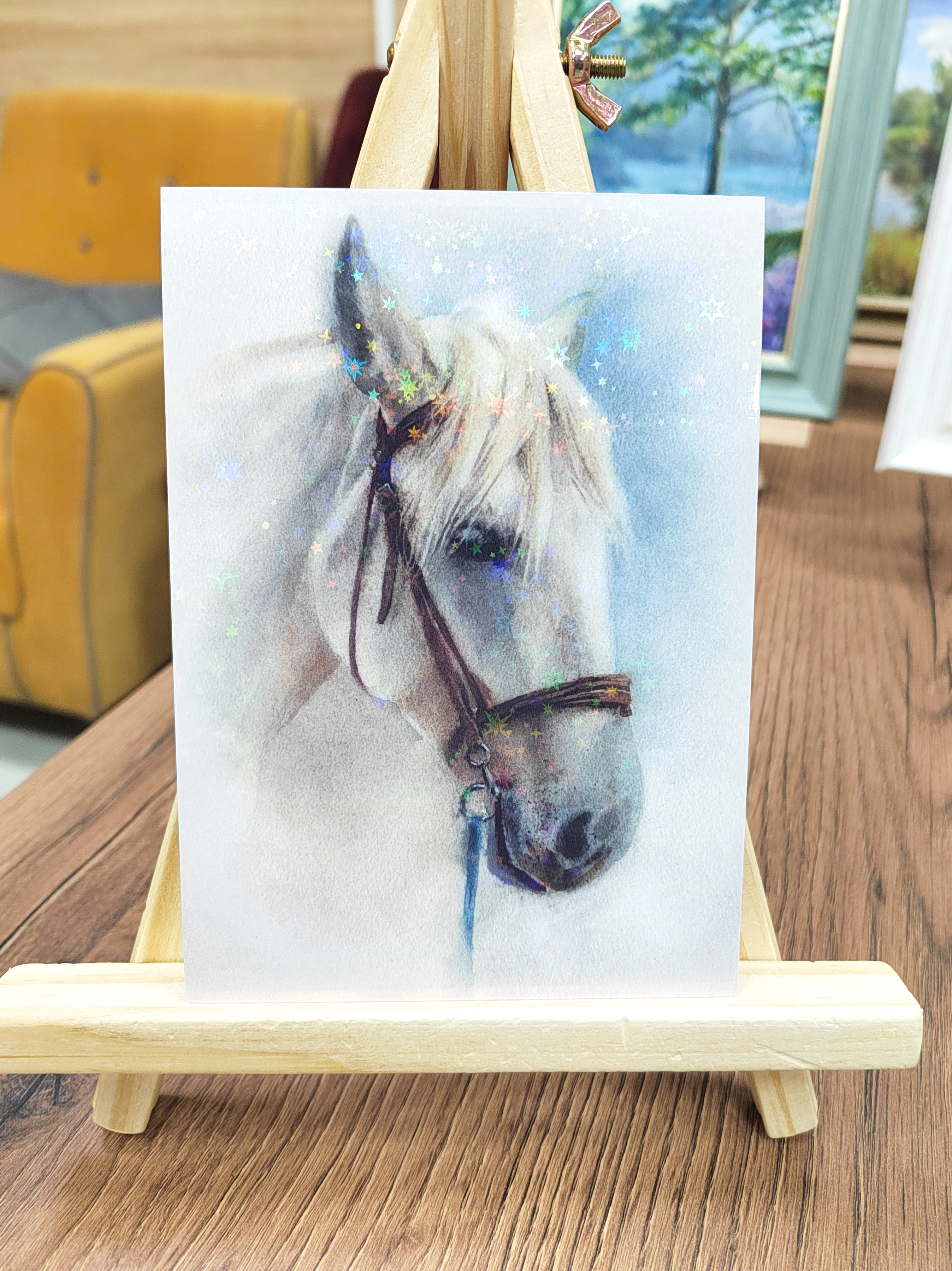 Печать цифровая. Ламинация "звёзды" на лицевой стороне. Оборот цветной. Художник Беседина Анастасия, написано акварелью. Тираж 100 штук.